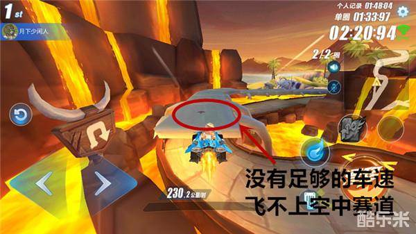 想要登上空中赛道,借助空喷的推力是远远不够的,车手们只有借助氮气的加速效果,才能顺利冲上空中赛道。而空中赛道前恰巧是一个U型弯道,因此只要不在U弯上出现失误,那么就能毫不费力地登上空中赛道。在空中赛道上第一个弯道过后紧邻的就是一个有落差的地势,车手们刚通过弯道还没来得及拉车头,就会获得一个落地喷,因而常常会在这里失控掉下赛道。最直接的解决办法就是提前漂移,在刚过弯道后就用小喷结束漂移过程,这样赛车就会不受到落地喷加速的影响了。