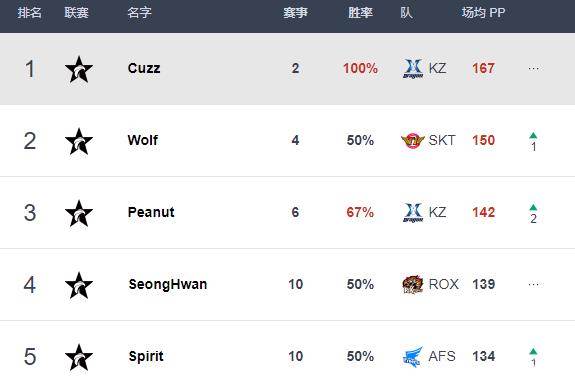 打野:随着KZ赛场上的出色发挥,两名打野Cuzz和Peanut也进入了打野榜的前五。