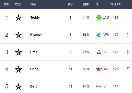 下路:JAG的天才ADC Teddy凭借多次MVP,也登上了榜首。