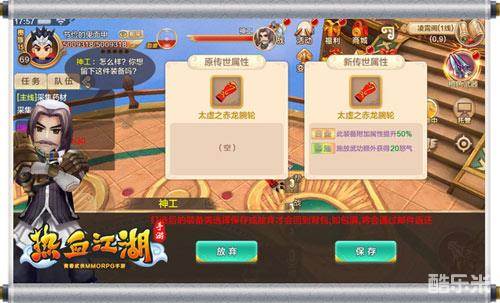 《热血江湖手游》全新版本除了在现有游戏框架内进行调整和完善,使玩家的体验舒适度更为提高外,还加入了更多全新的内容。如宠物、神兵界面增加了实用的评论功能,可以将自己的亲身体验传递给其他玩家,帮助新加入江湖的侠客更有目的性的选择最适合自己的道具。另外,全新传世装备打造功能更是能让玩家的战力直升!紫装和橙装通过打造提升为传世装备之后,不仅能大幅增加属性,还能够通告全服,威震整个武林。