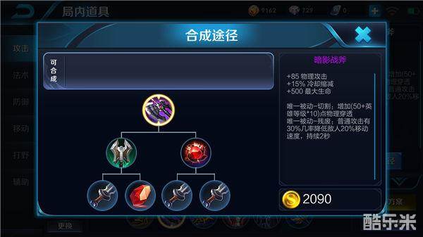 暗影战斧这件装备拥有物理攻击、最大生命和冷却缩减等较为全面的属性加成,其唯一被动切割还可以随着铠等级地提升带来相应的物理穿透加成,满足了铠在前期对于输出属性的需求。