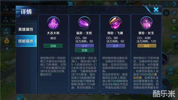 强弱分析:明世隐是功能性辅助,可以为我方一名队友提供输出和防御能加成,也可削弱敌方英雄输出和防御能力,但是其控制技能比较少,而且缺乏位移技能,怕被敌方英雄风筝消耗。
