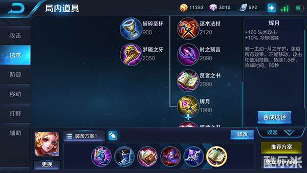 即便是逆风,妲己的法术伤害也要保证,不然就轮流为只有控制技能最有效果的弱辅助角色。逆风局敌方比较强势,团战中的妲己一套技能施放完成,很有可能被敌方黏住不能走脱,这个时候“辉月”的作用就体现出来了,“辉月”除了增加法术强度,减少技能的冷却时间以外还有一个主动技“月之守护”,可以保证妲己在随后的1.5秒内不会受到攻击,在这段时间中我们可以得到队友的支援,“月之守护”时间结束后,我们的二技能基本也冷却完成,配合一技能再打出一套输出,实现反杀。