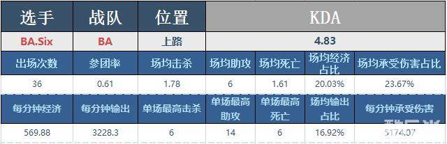 在本次春季赛预选赛中Six的个人表现极为突出,他代表战队出场37次,场均承受伤害达到23.67%,单场最高助攻数达到14个,场均死亡仅有1.61次,由此可见他在上路不易被对手针对,能抗能打是战队不可或缺的上路核心。