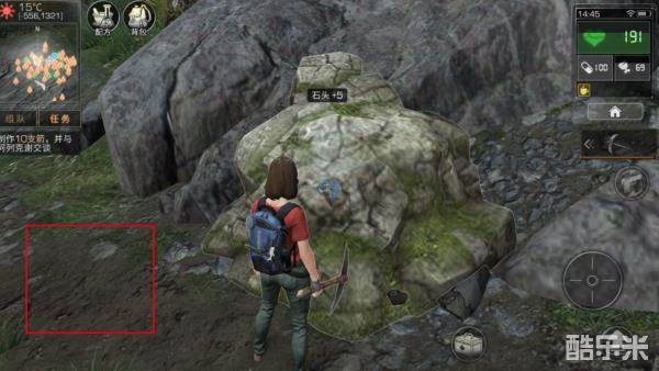 讲完移动的简单介绍,我们来说下如何获取资源!首先我们看到屏幕内是一个石头!我们换上挖石头需要的工具,然后看到屏幕中间有一个十字架,那是个准心,我们把准心瞄准需要开采的石头,然后点击右边的原型按钮,这时候我们就可以进行采集资源啦!
