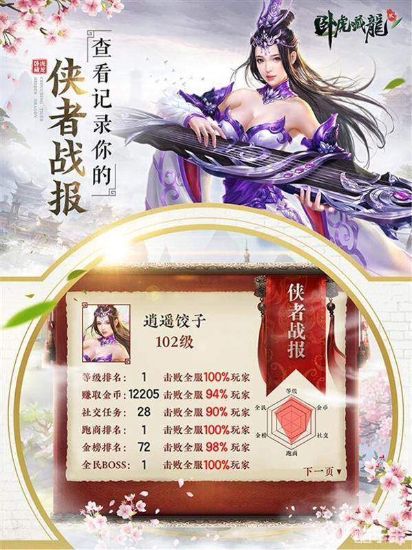 国战,不仅是千人同屏,激情酣斗的战场,更是少侠们扬名立万的所在。《卧虎藏龙贰》即将推出的“侠者战报”玩法,将为玩家们展示自己在本服务器中的等级、金币、社交任务、跑商排行、金榜排名、全名BOSS等方面的排名信息。为了不落后于同人,玩家们同样可以在新版本中上线后购买“经验令牌”,即可获取经验,赶超大部队。