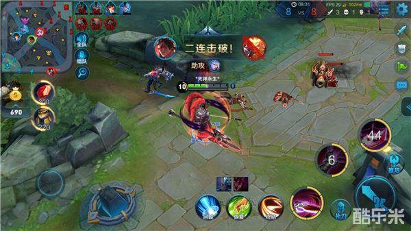 中期:顺风或者经济相差不大的情况下先出破军,这时吕布自身的防御力并不算高,没有大招的情况下可以带兵线,有大招的情况下配合队友进行一波团战。