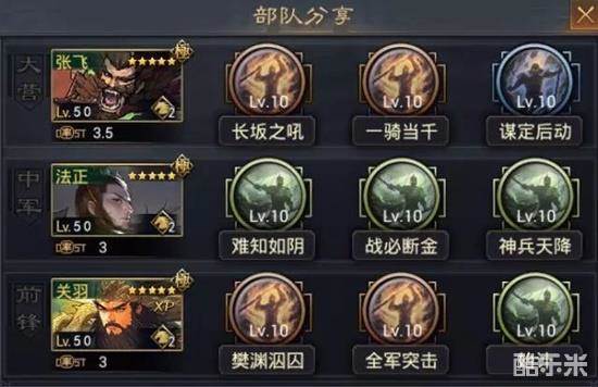前锋蜀关羽主要是负责控场,为张飞的输出提供环境,全谋略加点,这样会使【始计】和【全军突击】的效果更加明显。