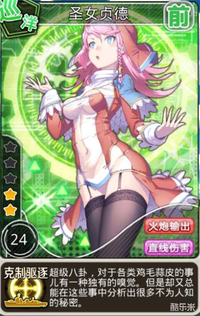 在星阵中,其实贞德的存在是比较尴尬的,她的生存能力虽然为“S”,但是实际上感觉其生存能力不如其他前排,如果被集火,很容易被秒,所以推荐放在中排或者后排(方便变阵后当一个临时前排),考虑到她技能的特殊性,优先放在敌方直线单位比较多的那一行。