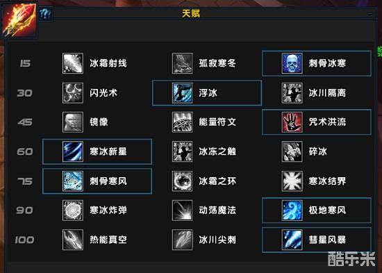 刺骨寒冰、浮冰、咒术洪流、寒冰新星、刺骨寒风/寒冰结节、极地寒风、彗星风暴