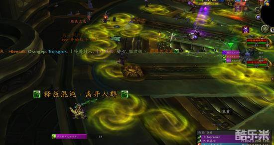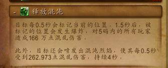 (2)释放混沌的跑动原理其实和古尔丹的跑火差不多,全团点名,每人0.5秒一次一共出4个圈,吃一个不会死,但是尽量不吃,只要移动起来肯定就不会中,后跳很好用,这也是我前面推荐远遁的原因。