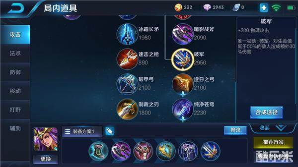分析:魔女斗篷增加了法术防御,最大生命的同时,被动-迷雾能在脱战后为雅典娜提供一个吸收法术伤害的护盾,能很好的抵御来自敌方法师英雄的伤害威胁。破军增加了物理攻击,被动-破军更是大大加强了雅典娜的收割能力,让雅典娜对敌方的后排脆皮英雄有了更大的威胁。