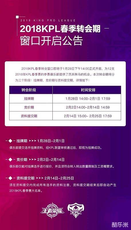 2018KPL春季赛预选赛结束后,在经过两周的等待后,万众期待的2018KPL春季转会窗口终于在1月28日14时正式开启。本次转会期分为三个阶段,分别为:挂牌期,竞价期与资料提交期。