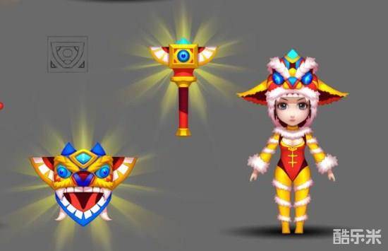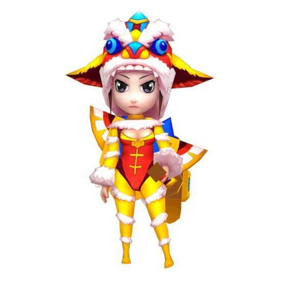 大小姐这身新年时装,将中西方时装设计理念进行了巧妙的结合,可谓是中西合璧。借鉴于公主装的肩部下摆设计,与中国传统肚兜造型,形成了鲜明的对比,再加上手部与腿部的蕾丝花边,简直将中西服装文化的精髓,演绎的淋漓尽致。整套时装最突出的亮点,在于礼帽风格的头饰装扮,为整体时装起到了点睛的作用。该头饰依然采用舞狮造型,眼睛与其他细节部分,更加活灵活现,栩栩如生。礼帽外檐设计微微上翘,突出了大小姐的活泼可爱的一面,同时与整套时装搭配起来,更加协调美观。
