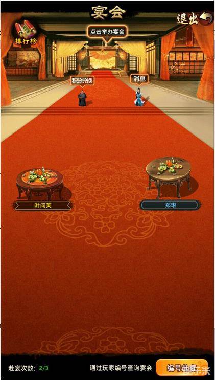 举办宴会可得宴会积分,大量好礼等你兑换!赴宴人数越多,赴宴档次越高(赴宴还能得丰厚宴会积分哦,)最终拿到的宴会积分越多哦~所以记得邀请别人来赴宴!当然,携礼赴宴还是老鼠捣乱,任君选择哦~也望君三思而后行~