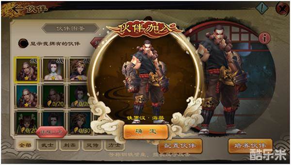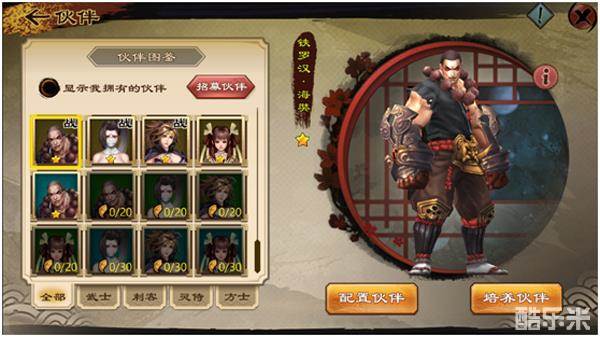 左部为所有伙伴的展示区,点击下部的职业切换按钮,可查看对应职业的伙伴。右部展示了选中伙伴的形象;以及“配置伙伴”界面、“培养伙伴”界面的入口,点击后打开对应的界面。