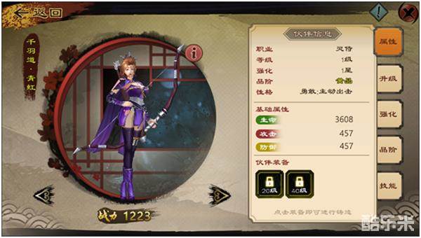 在伙伴首页,点击“培养伙伴”按钮后即可打开培养伙伴界面。信息栏中详细介绍了所选中伙伴当前的基本信息和基础属性以及装备信息。点击右侧的“升级”“强化”“品阶”“技能”按钮会打开对应的界面。