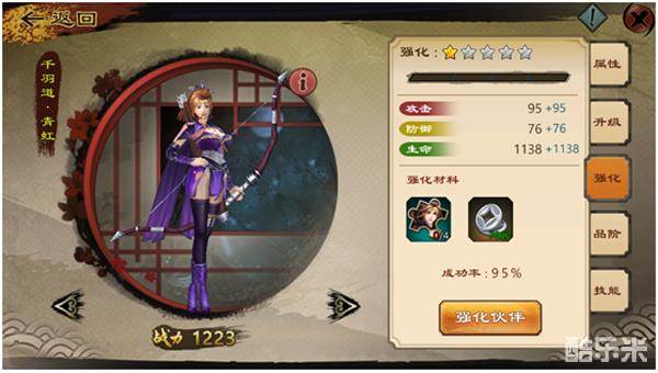 伙伴强化界面左侧为选中的伙伴形象。右侧可以看到此伙伴当前的强化度和此强化度增加的属性,以及强化所需的材料和成功率。