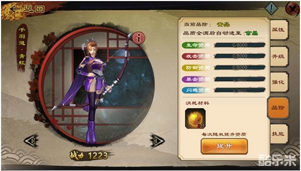 伙伴品阶界面左侧为选中的伙伴形象。右侧为伙伴当前的品阶,以及当前品阶下对应的伙伴资质进度条和增加资质的材料。每次提升资质,随机为其中一项资质加点。资质进度条全部长满,伙伴就会进阶到下一个品阶。