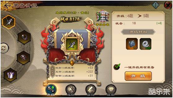 进入锻造界面就可以看到装备增强面板,消耗鬼铁石和金钱就可以升级装备了,鬼铁石通过刷副本就可以获得,点击升级材料可以查看材料的详细介绍。点击材料介绍界面的“获得”按钮,可查看更多获得该材料的途径。