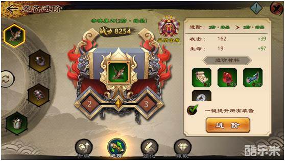 烈火中间的图标为当前选中的装备。图标上方可查看装备的名字和当前的品质。图标下方的数字为当前装备的品质等级和下级的品质等级。右侧属性版中可查看当前品质的属性和进阶后可增加的属性,以及进阶所需的各种材料。