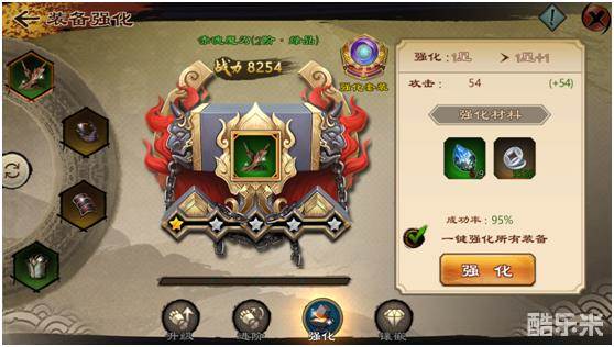烈火中的图标为当前锁选中的装备。图标下方的星星表示当前的强化度,进度条满会增加一颗亮着的星星代表强化度又上了一个阶段。右侧的属性版可以查看当前的强化度、当前强化度的属性和下级的强化度、下级强化度的属性,以及强化这件装备所需要的材料。