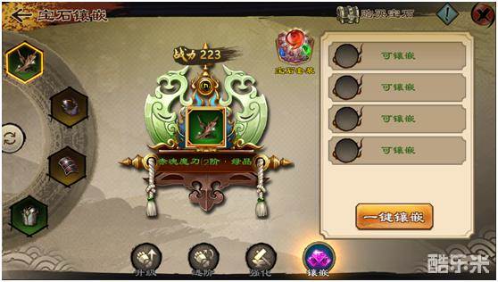 中间玉盘上为当前选中的装备图标。右侧为该装备上可用的宝石孔。如果背包中有宝石,点击“一键镶嵌”按钮后会挑选等级最高的、战斗力最高的宝石自动镶嵌到在宝石孔上。