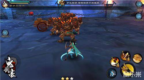 护送马车的关卡,第二简单的一关,只需要站在马车侧面,跟随马车前进,等怪物刷新后与怪物站在一条直线上,使用【流光飞刃】加上【疾风刃舞】就可以快速把怪清理掉,杀三波怪即可获得S。