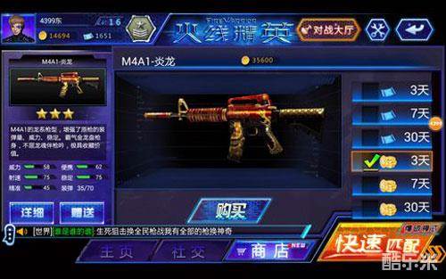 如果你的金币攒到一定数量,东东极力推荐你买炎龙来体验一番,刚刚进入游戏中的时候所赠送的那把枪也是炎龙,M4A1炎龙的整体属性都要比M4A1-突袭要高上许多,价格当然也要贵一点点,不过35600金币也不是很难赚,多做任务很快就可以攒够了!