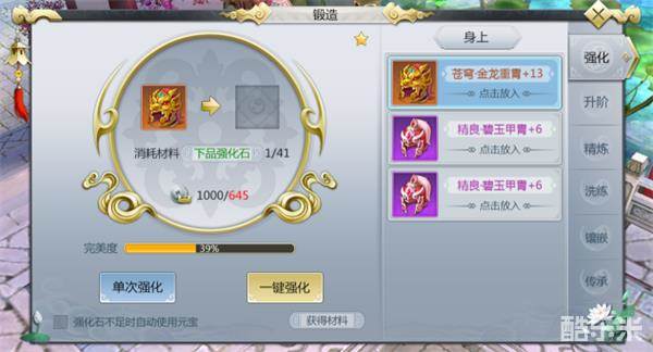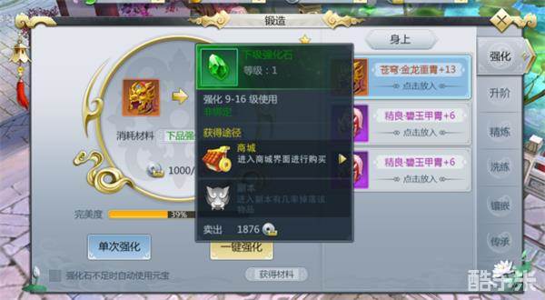 所有任意等级的装备都可通过消耗对应品阶的强化石与绑铜进行强化以提升装备自身的属性,逐渐填充强化完美度。点击“单次强化”可对该装备强化一次,如果背包内有足够的强化石就可以选择点击“一键强化”,一次性将装备强化至下一强化等级。