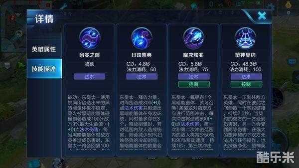 堕神契约:使用后将对命中的目标建立一个契约链接,短暂时间内双方都无法动弹,并且要承受对方所受的同等伤害,在使用瞬间东皇太一还可获得三枚黑暗能量体。东皇太一可以在团战中利用该技能快速控制并击杀敌方的主力输出英雄。
