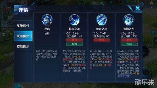 破云之龙:使用后赵云向指定方向刺出数枪,对指定方向的敌人造成物理伤害,若命中敌方英雄则回复自身生命值。该技能是赵云的主要输出技能,并且提高了一定的续航能力,使其在残血时能够依靠此技能迅速回血。