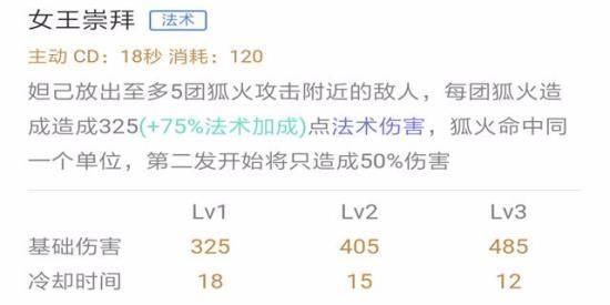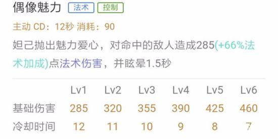 数据分析:该技能有5段伤害,伤害成长值很高,而且冷却时间较短,所以作为主加技能是毫无疑问的。