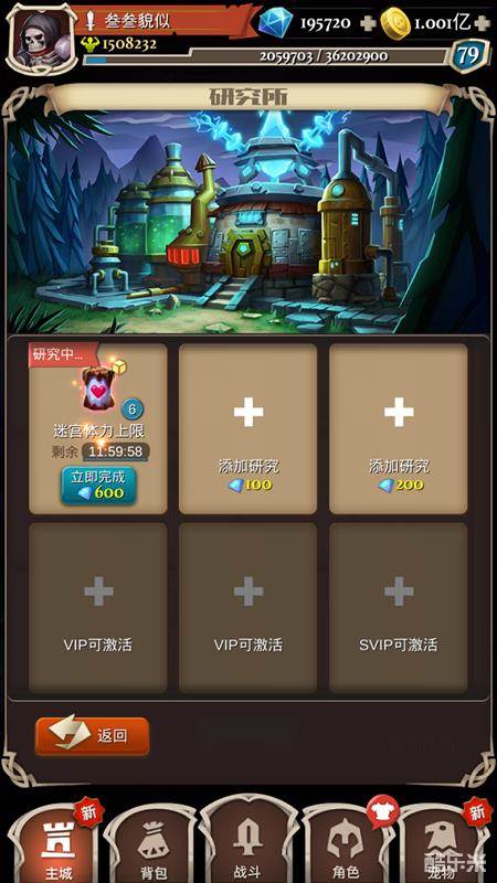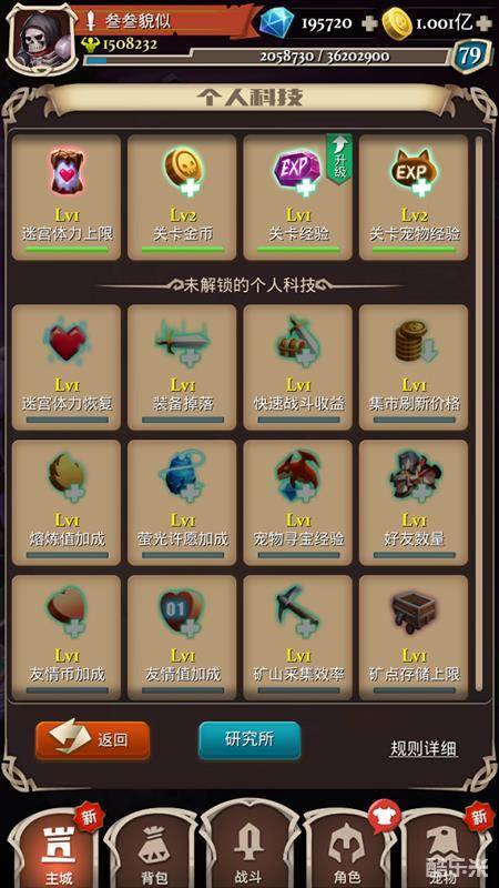 个人科技类似天赋,用来增强游戏各个玩法收获,例如增加迷宫体力上限、提高远古遗迹挂机效率等。并不像别的游戏,只有靠VIP特权才能获得。