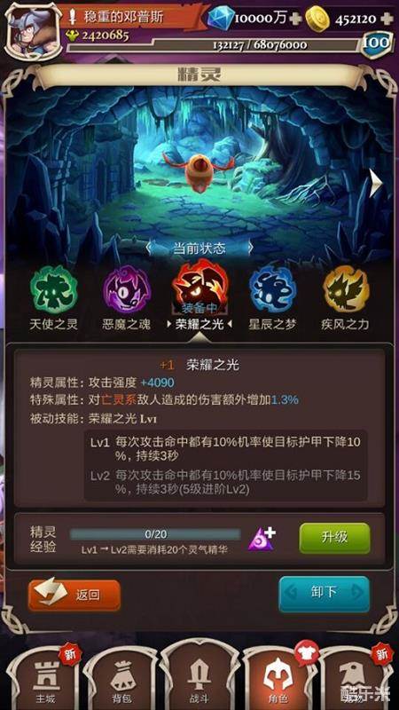精灵升级到一定等级后可通过幻灵之魂进阶,进阶后的精灵不仅外形会有更酷炫的变化,被动技能也会获得提升。