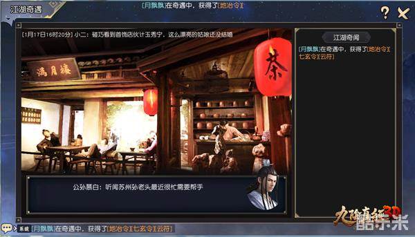 在本次新资料片中,游戏将在原有的三大奇遇(心魔、心魔幻境、地宫秘境)基础上再次增加新奇遇,本次奇遇为随机,为休闲类玩法,侠客们可在江湖茶馆之中收听到江湖之中的奇闻异事,并随机出现奇遇事件。侠客可通过上交部分材料来完成奇遇事件,最终可获得一份奇遇礼包奖励。 奇遇玩法的魅力在于未知,未知的留言,未知的奖励,一切都要靠侠客仗剑而行,自己探索。