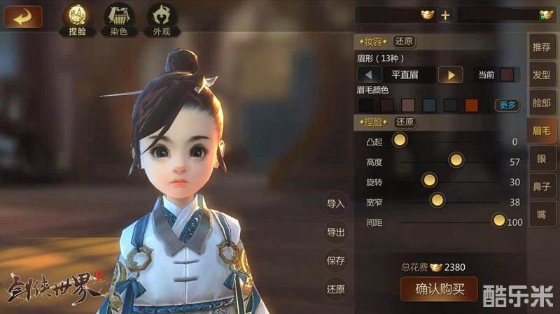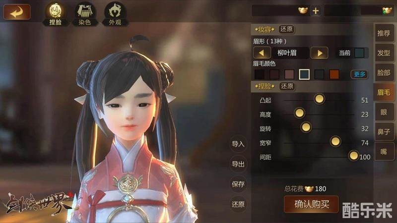 “眉目传情”一词,说明眉毛和眼睛可表达人的情感。眉目互相配合,面容背后的故事宛如诉之于口。捏脸系统中“眉毛”可以对眉形进行选择,在眉形基础上,调整颜色、粗细、角度以及在脸上的相对位置。对眼睛的调整则更精细,含有眼睛形状、美瞳及颜色调整,眼妆及颜色调整三大部分,还有15项微调内容。细长眉眼媚意丛生,眼角微提神采飞扬,不同的眉眼展现了不同的精气神,忧郁还是开朗都能从眉眼间辨识。