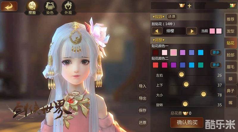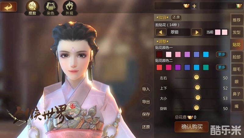 富有特色的“贴花”也在捏脸系统中,为已经将面孔调整完毕的侠士们增添乐趣。贴花中有翩翩欲飞的蝴蝶,也有害羞、心形等能表达心情的形状。而上下左右,角度和大小的调节,让贴花出现在脸上的任意地方。贴花能用两种颜色进行组合搭配,让同样的贴花能展现不同风采。