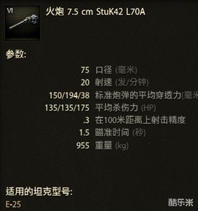 E-25的主炮为一门StuK42 L70A型 75mm主炮。主炮的均伤为135,在使用普通AP弹时穿深能达到150,使用金币APCR弹时穿深可以增加到194的水平。AP弹穿深一般但是在压上APCR弹之后,在8级房中也能保证一定的击穿率。