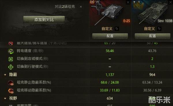 隐蔽能力绝对是E-25的最大亮点。E-25的隐蔽能力在所有TD里面可以说是顶尖的水平。各项辅助因素都齐备的情况下隐蔽值可以达到67左右。眼车想要点亮一台藏好的Strv 103B会是一件十分吃力的事,但是想要点亮E-25就更难了!有时甚至会出现中坦被E-25的近距离黑枪击毁却依然不能将它点亮的尴尬状况!