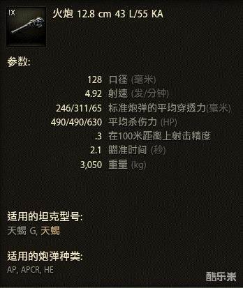 “天蝎”的主炮为一门L/55 KA型128炮。主炮的标准单发伤害为490。在使用普通AP弹时穿深就已经能达到246;在切换使用金币APCR弹时穿深可以增加到311的水平。凭这个穿深级别,莫说在8级房,就是在10房里“天蝎”都能有着不错的击穿率。而且,“天蝎”的这门128炮属于高伤炮。单发经常能打出500+的伤害,高出平均杀伤的纸面数据。