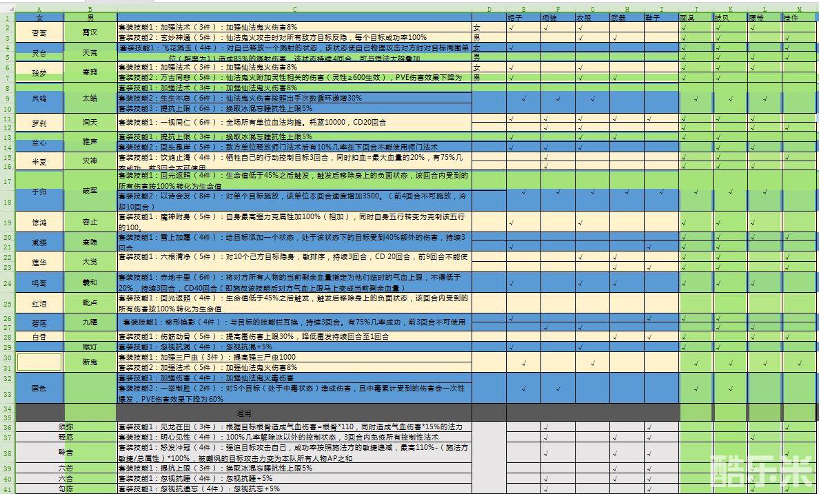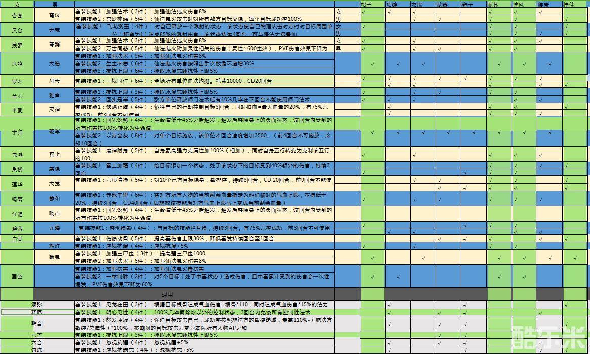 如图所示,女性大力输出装可以选择搭配的套装有凤鸣,释厄,于归,六芒,腾蛇,六合这6套套装,除去没有作用的凤鸣(强法术伤害)腾蛇(忽冰)六合(忽睡)剩下可以搭配的只有万金油于归4件套(于归=破军)和提高抗性的六芒,以及带明心见性效果的释厄4件套。