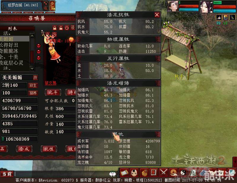 因此,推算:召唤兽最终速度=(敏初值+敏捷属性点)*成长率*(1+坐骑管制加成率)+召唤兽加速技能SP。