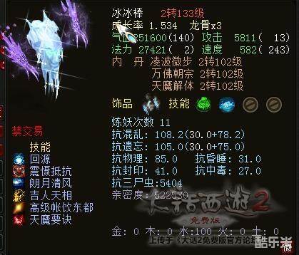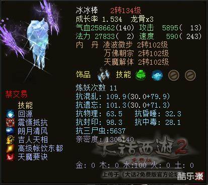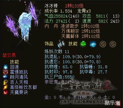我这种打法可能有些人持不同观点,还有人可能会说不抗仙法,我这个就这样打,如果你们有自己的想法也可以晒出来,大家一起研究。希望帖子能起到抛砖引玉的效果,也希望大家可以举一反三,有不同的想法,都可以拿出来讨论一下。我想随着坐骑点化数值的变化会有好多其他的抗性打法。给你们看看现在我的冰块,数值略有提升,坐骑现在3.7万的熟练了。