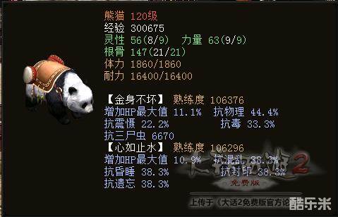 盘上的话,这个宝宝就应该抗混117、遗忘104、物理97、仙法97、鬼火41,感觉也差不多了,应该可以抗的住了!这里我们没有加上饰品的抗,饰品也可以提抗的,还有如果你的坐骑是点化坐骑,仙法和鬼火是可以继续上升的。点化了的,仙法盘上就能达到100多了。
