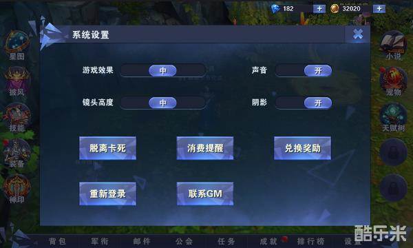 首先,打开设置界面,看见正中间上方有两个拖动条,一个是调整游戏的表现效果,另一个是调整游戏时的角度高度,大家可以自己调整适合自己的游戏角度;,而拖动条右边有显示是鞥银河阴影,可以选择声音开关和阴影的开关;下面也有几个按钮,分别是脱离卡死、消费提醒、兑换奖励、重新登录和联系GM。