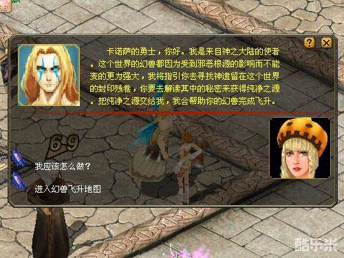 带上纯净之源,将它交给神使卡弗隆(卡诺萨城297,533)吧,他将祝福于这颗无暇的晶体,将之转化为神之召唤,并帮助你符合飞升条件的幻兽(注:星级需达到40星)打开另一个世界的大门,完成梦寐以求的转世飞升。