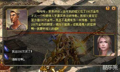 某个偶然的机会,小贩贝塔(卡诺萨城292,358)得到了神遗失在雷鸣大陆的第二块封印残卷,他珍藏多年,总觉得铭刻在其上的文字里隐藏着惊人的秘密,为此,他一直在寻找某个拥有着第一块封印残卷的有缘人。若你能带上第一块残卷找到他,你将只需要用200万金币来和他换取第二块封印残卷。
