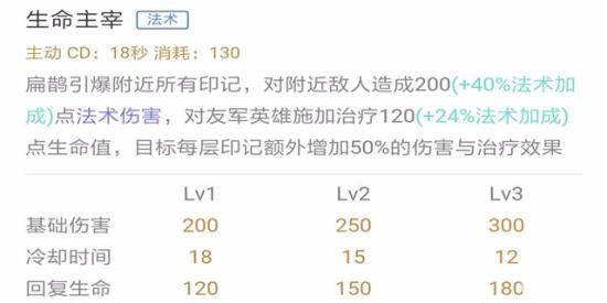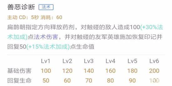 数据分析:此技能的法术加成比起其他技能来说很高,技能等级的提高导致对敌人造成的伤害也会增加。而且释放时扁鹊自身也能恢复生命与叠加恢复印记,等于自带血药,所以推荐主加。