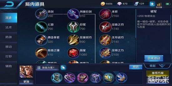 破军这件装备提供了超高的物理攻击加成,并且被动的效果配合杨戬1技能的斩杀效果可以更容易刷新1技能达到收割战场的目的。